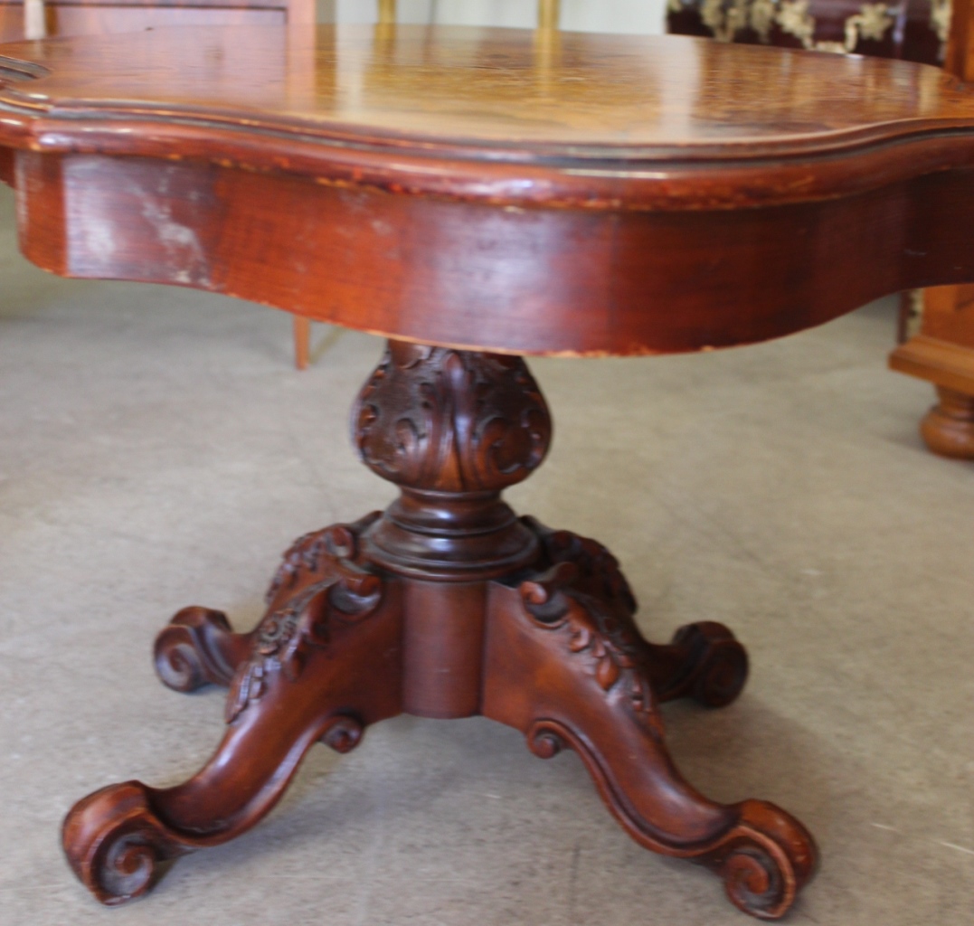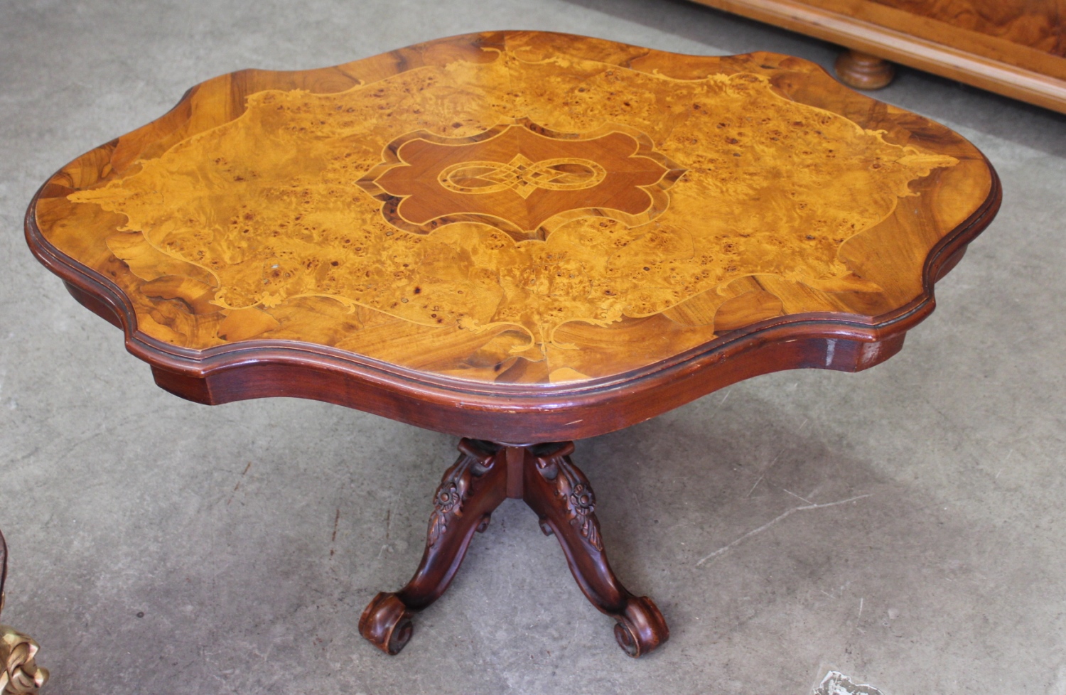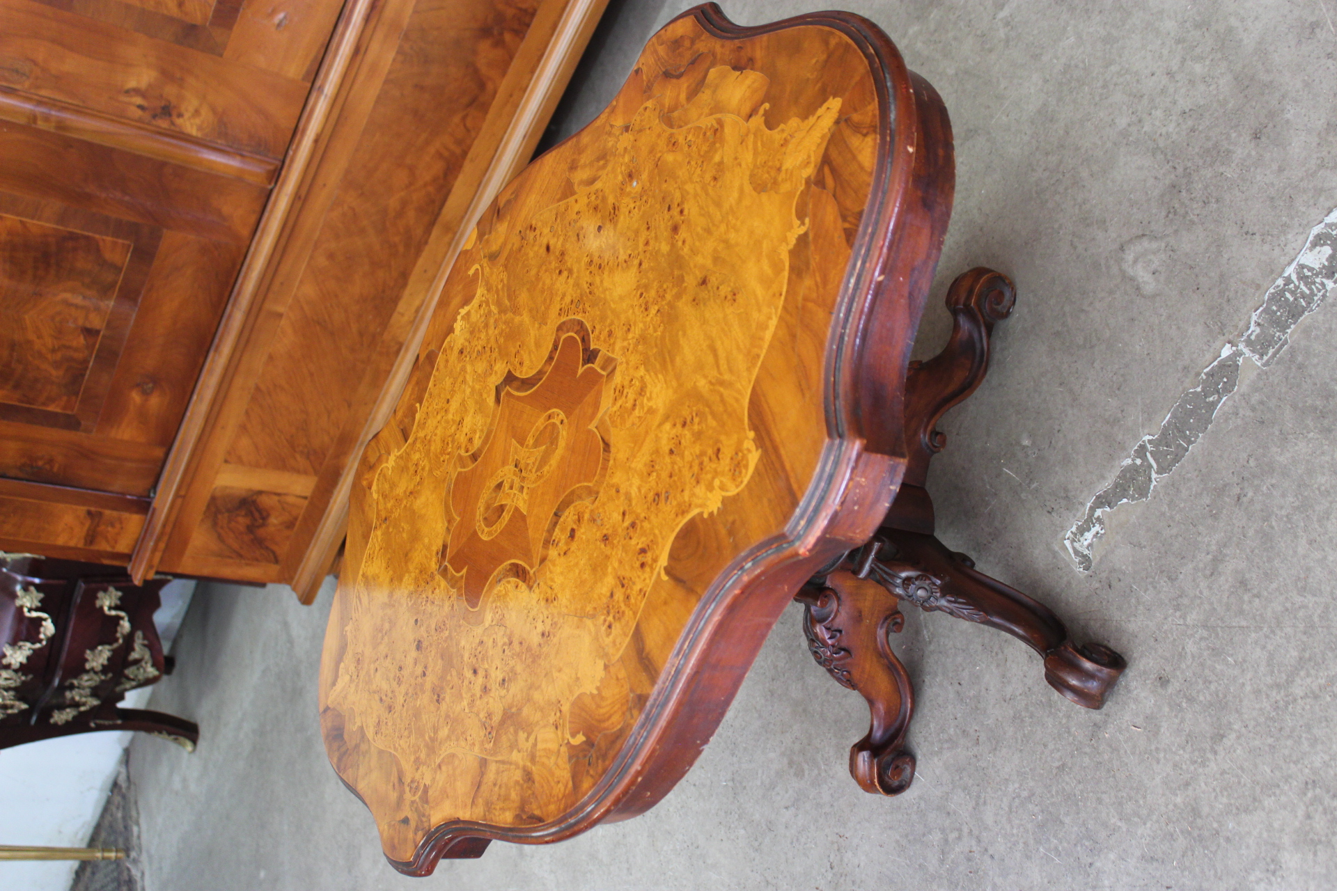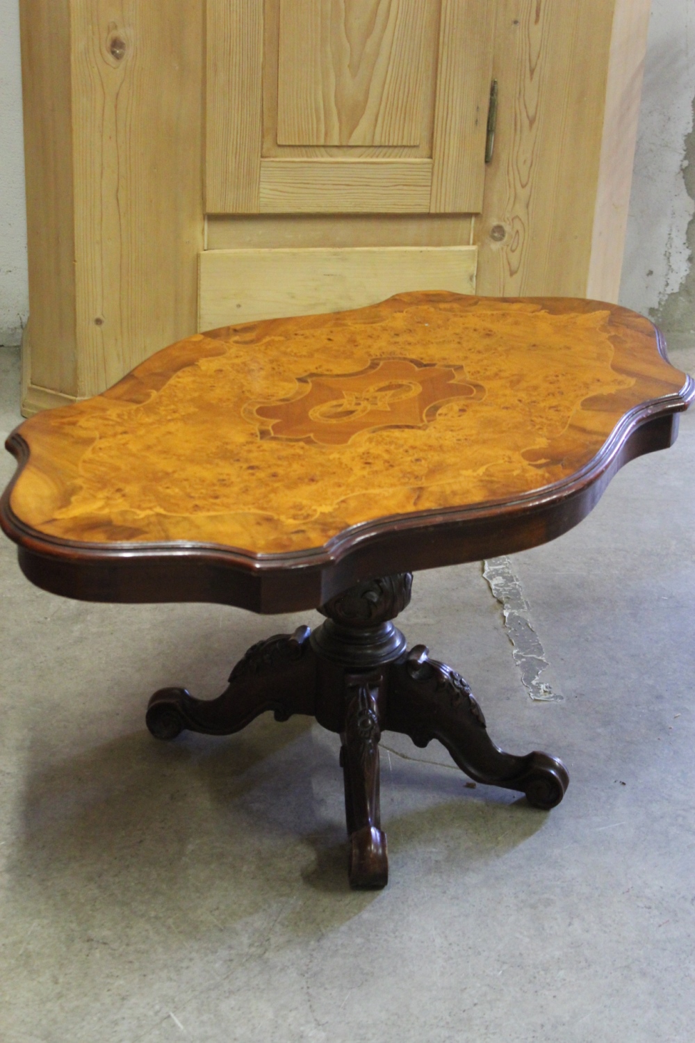 Alter Couchtisch /SalontischStil-Louis Philippe mit kunstvollem Furnier.Die geschnitzten Beine sind massiv Nussbaum.