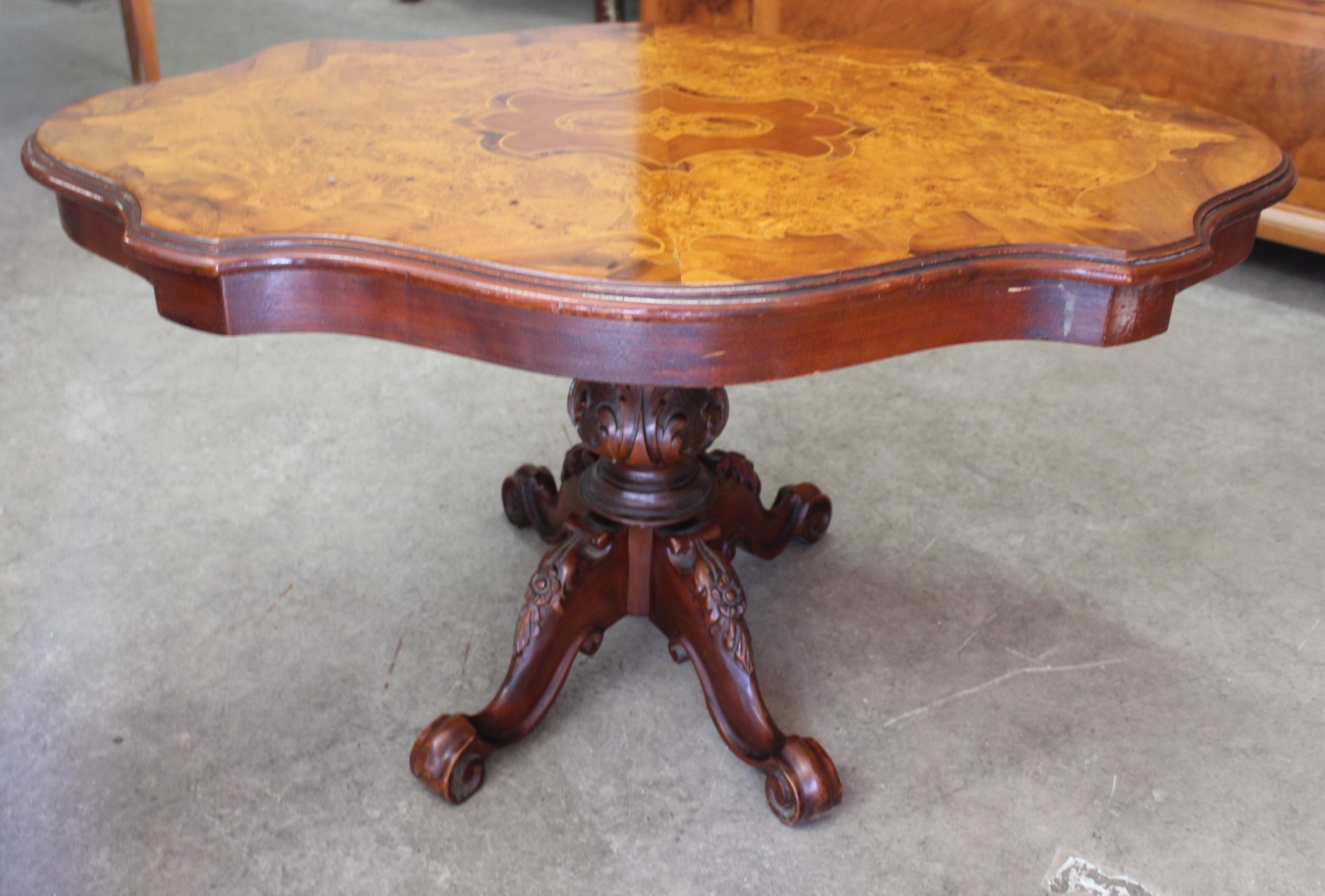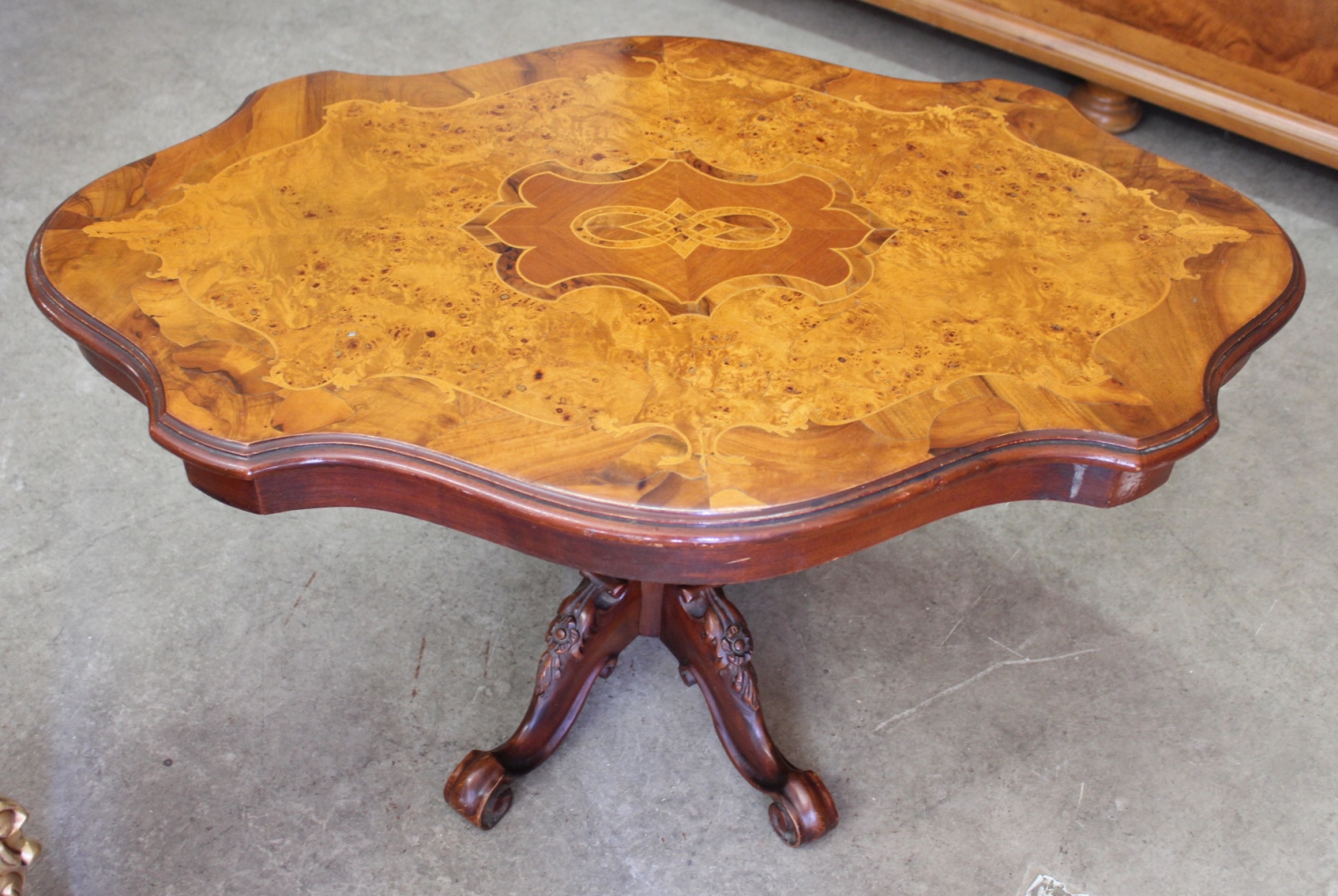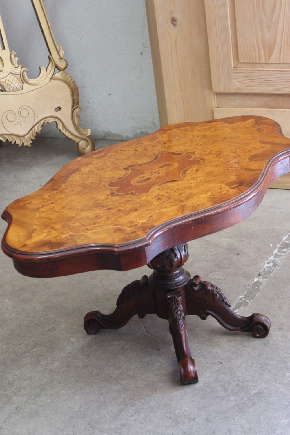 Alter Couchtisch /SalontischStil-Louis Philippe mit kunstvollem Furnier.Die geschnitzten Beine sind massiv Nussbaum.