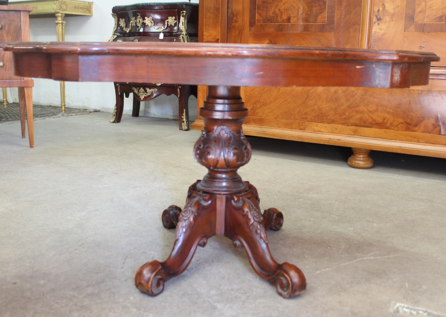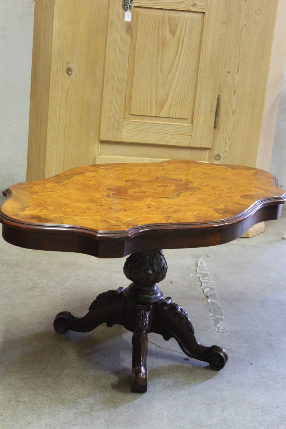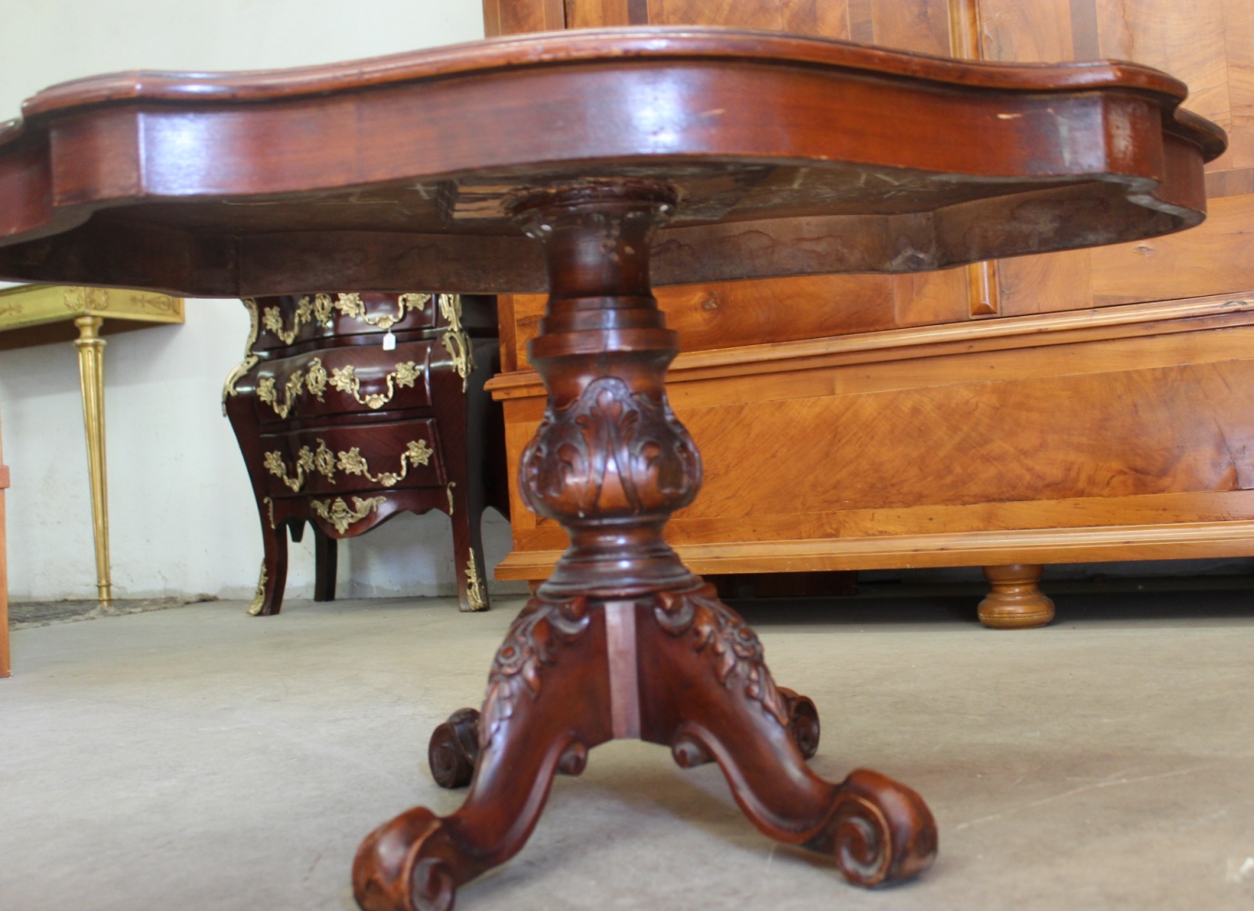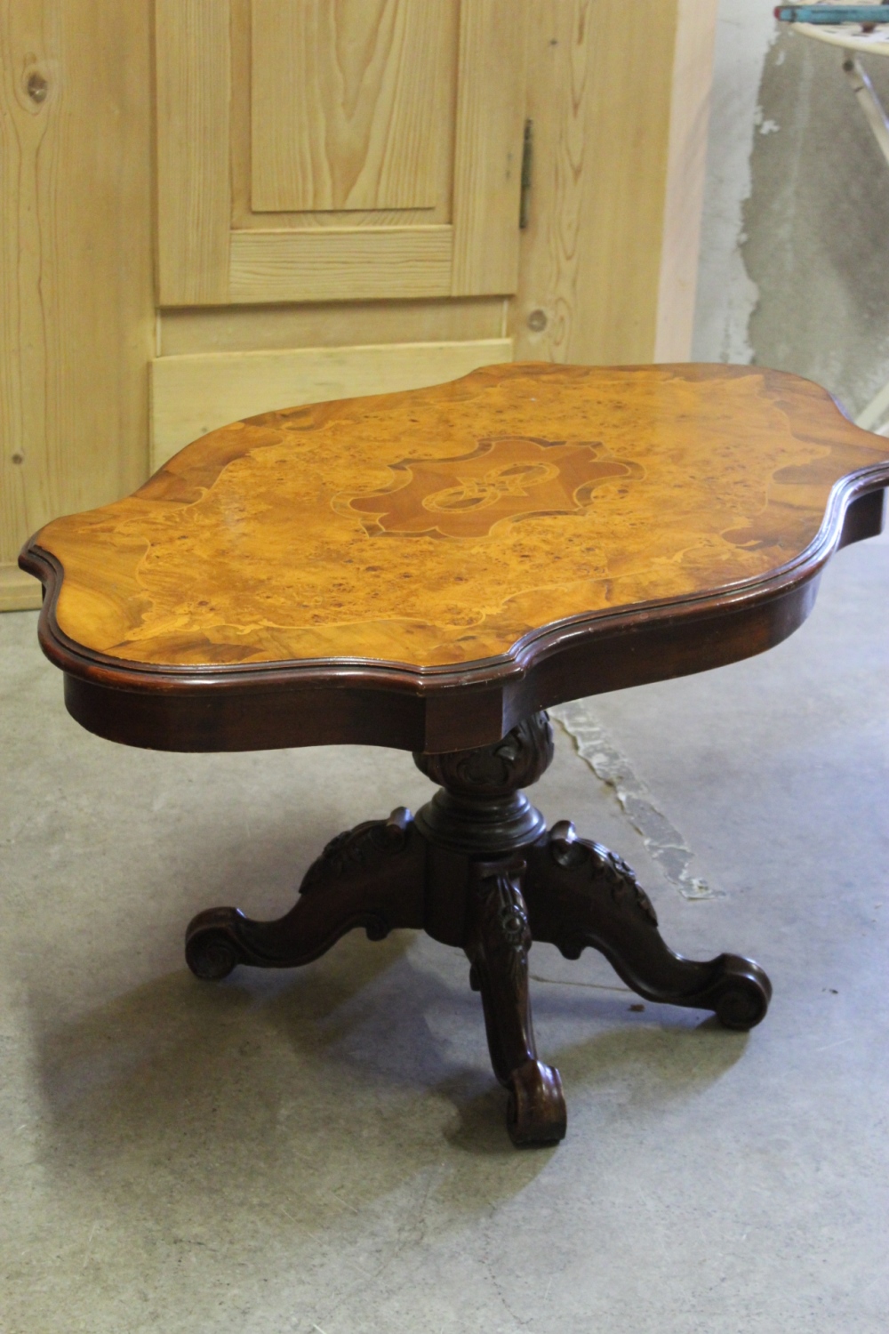 Alter Couchtisch /SalontischStil-Louis Philippe mit kunstvollem Furnier.Die geschnitzten Beine sind massiv Nussbaum.