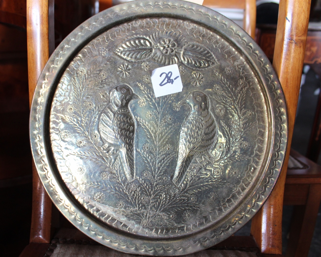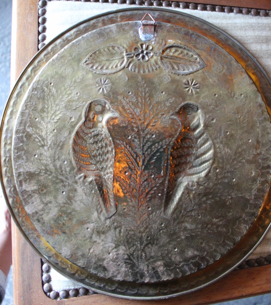 Kupferteller mit zwei VögelnRückseite mit Aufhänger.