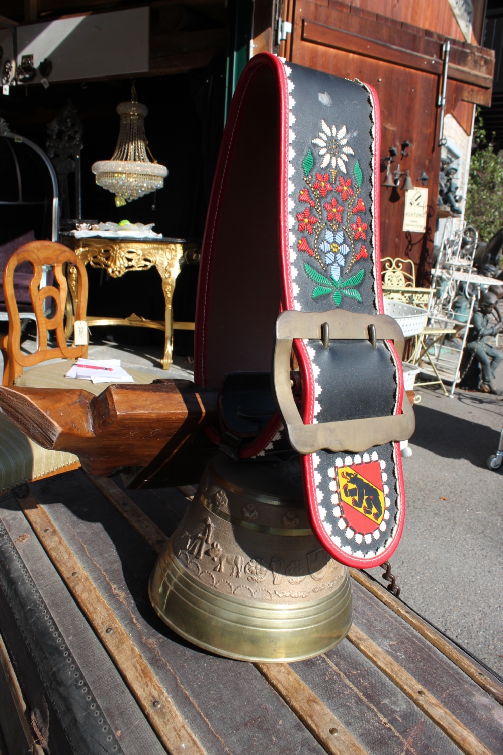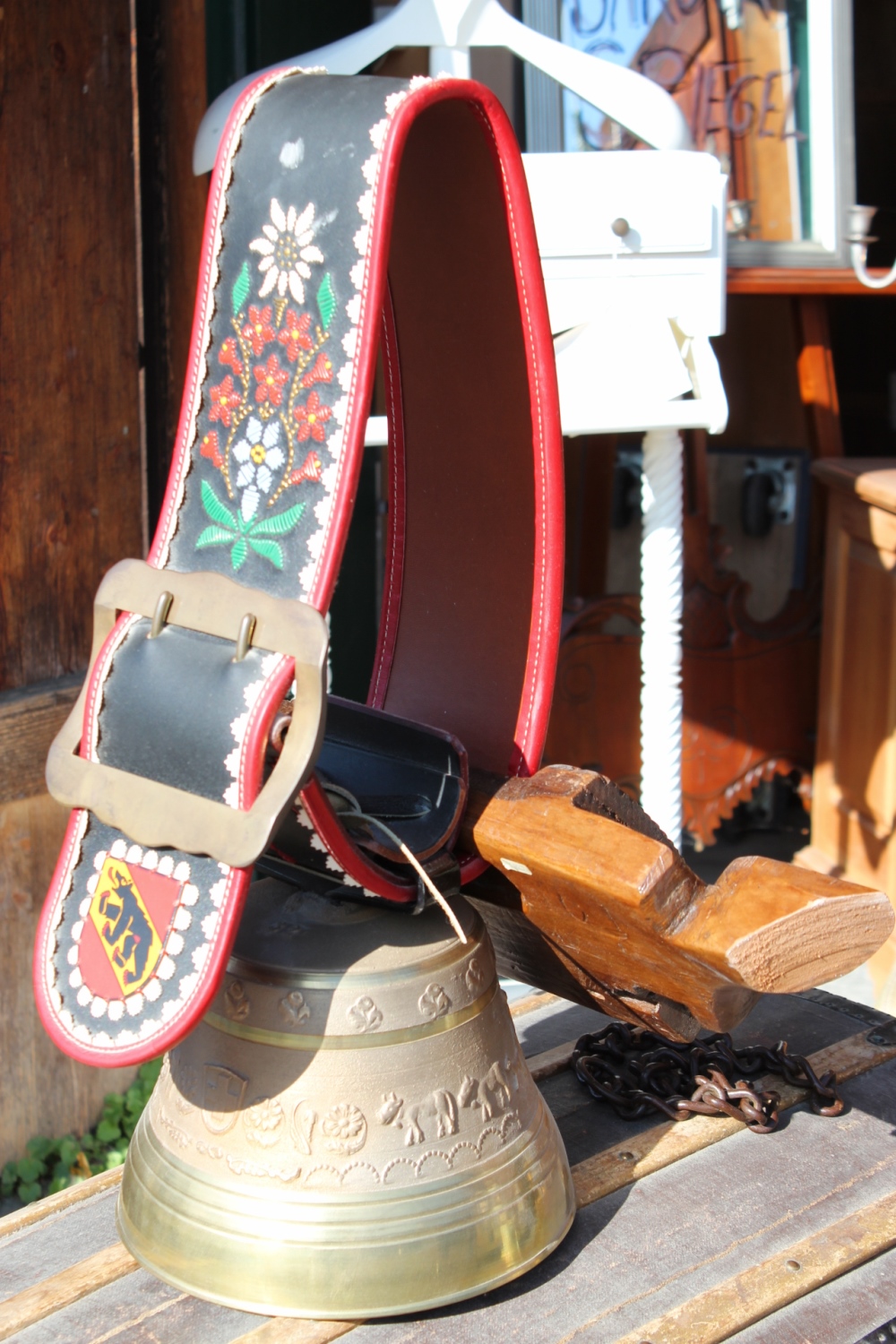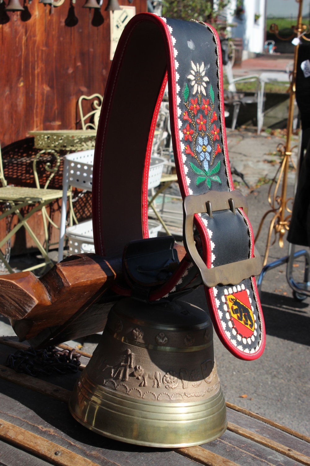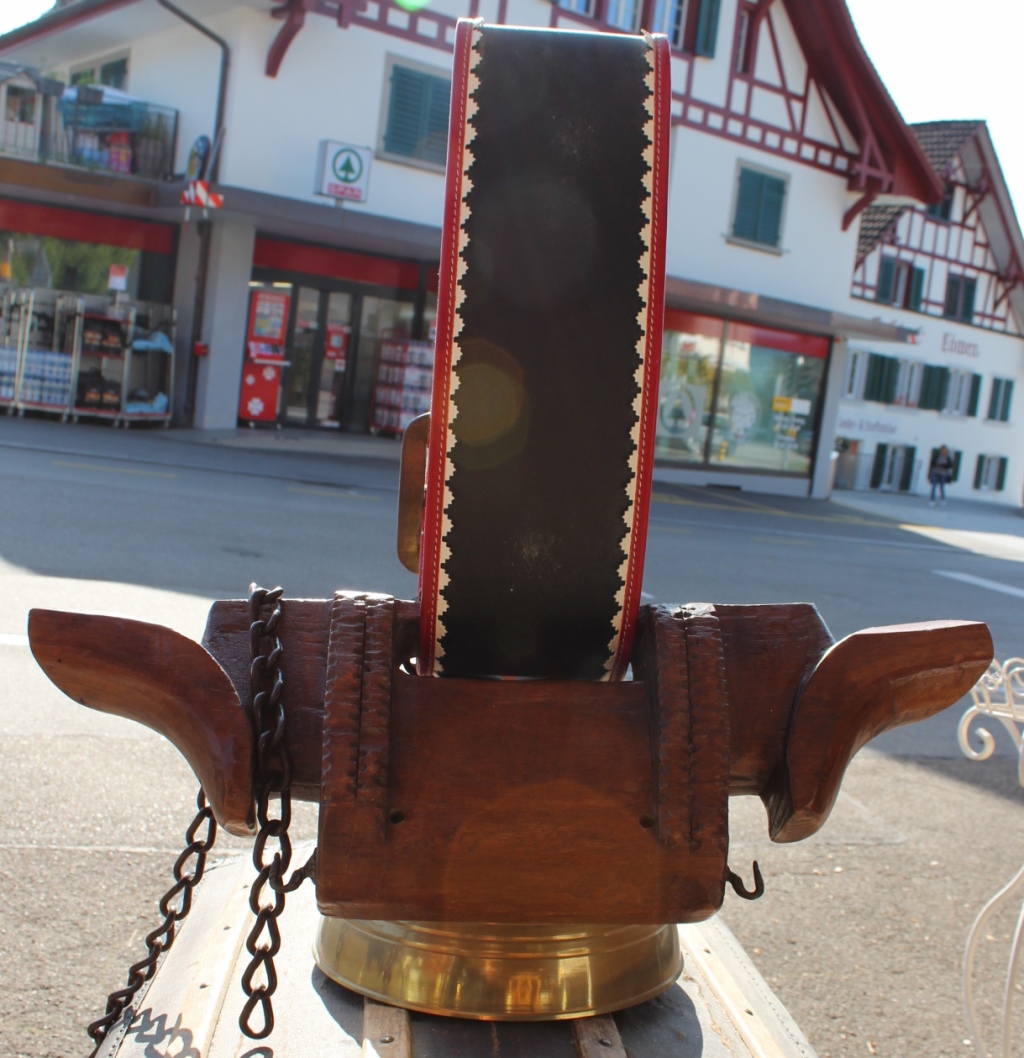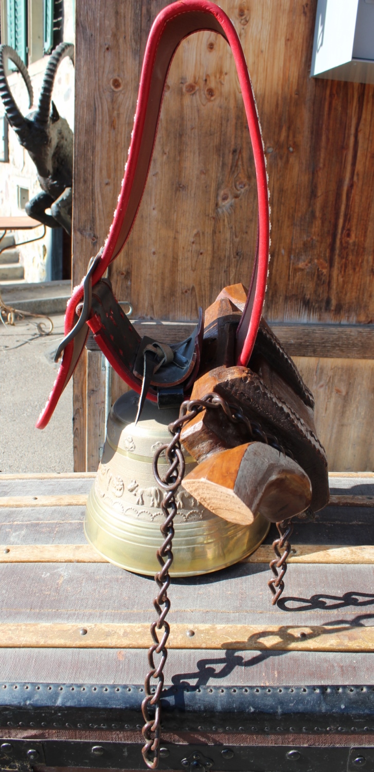 Seltene Kuhglocke, Lederhalsband mit Berner Wappen und Blumen Stickerei.