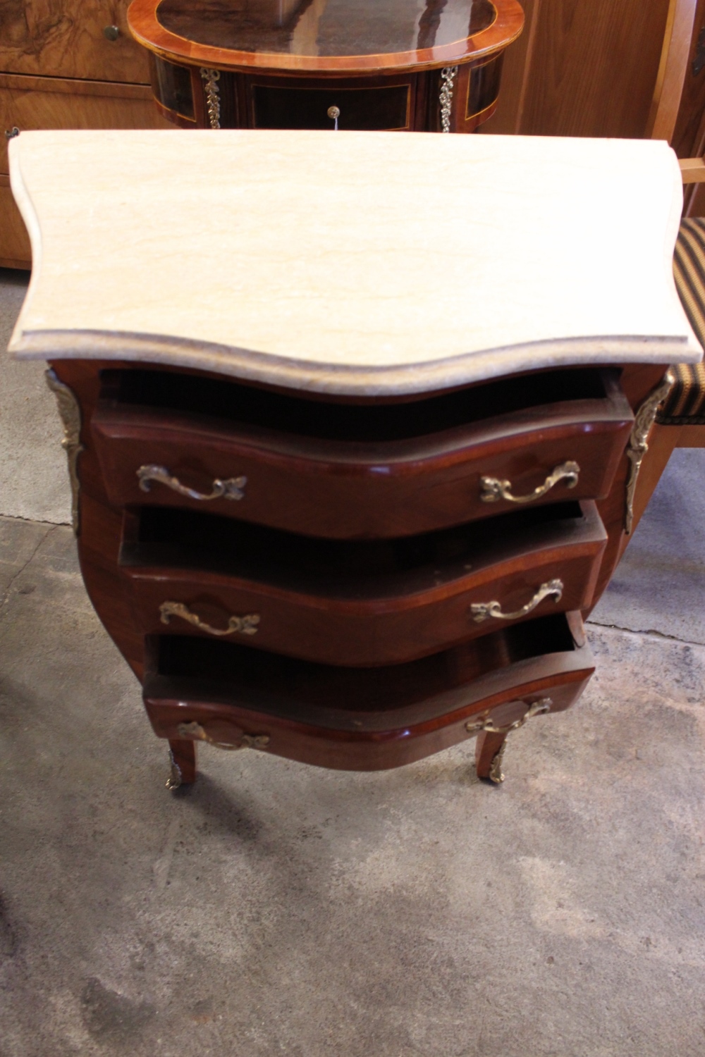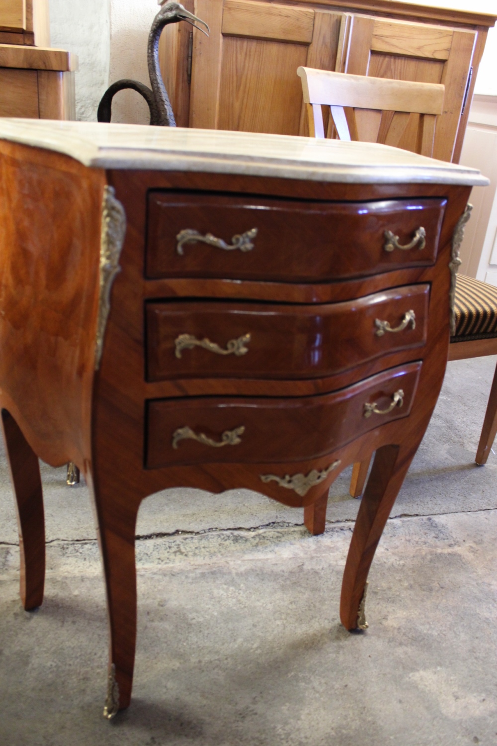 Kommode mit beiger Marmorplattedrei Schubladen,kunstvoll furniert mit goldenen Hangriffenund goldenen Beschlägen an den Füssen.verkauft