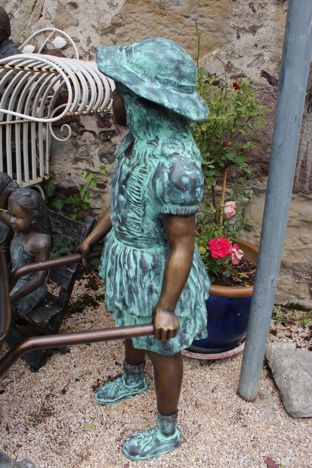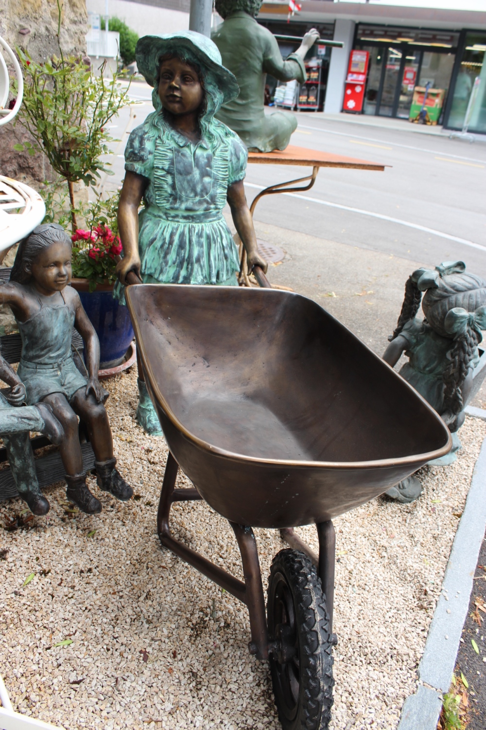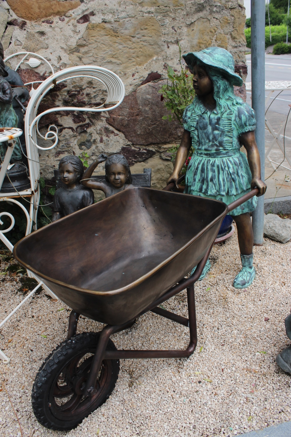 Bronzefigur / BronzeskulpturMädchen mit Stosskarette / Schubkarrefür Blumen.