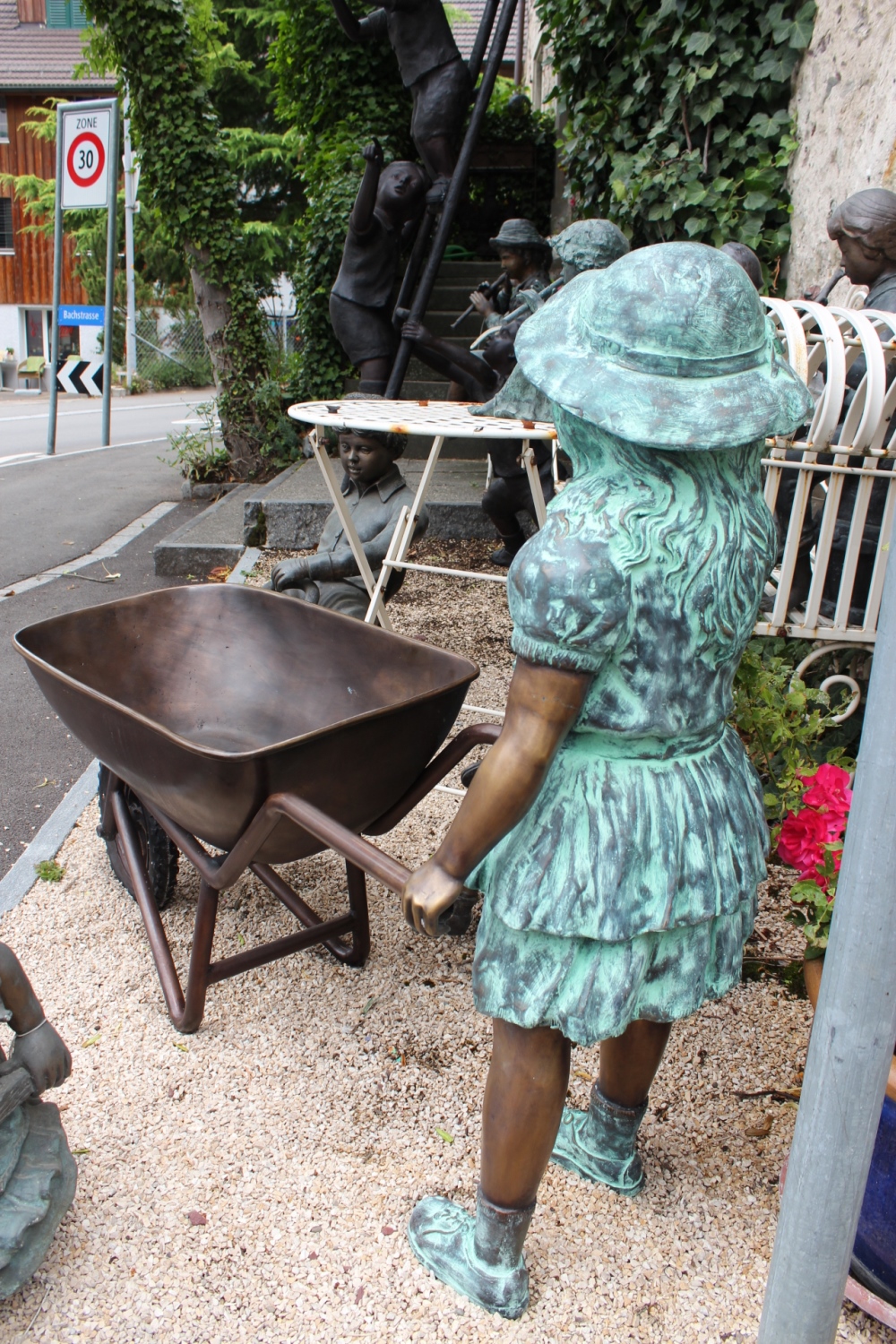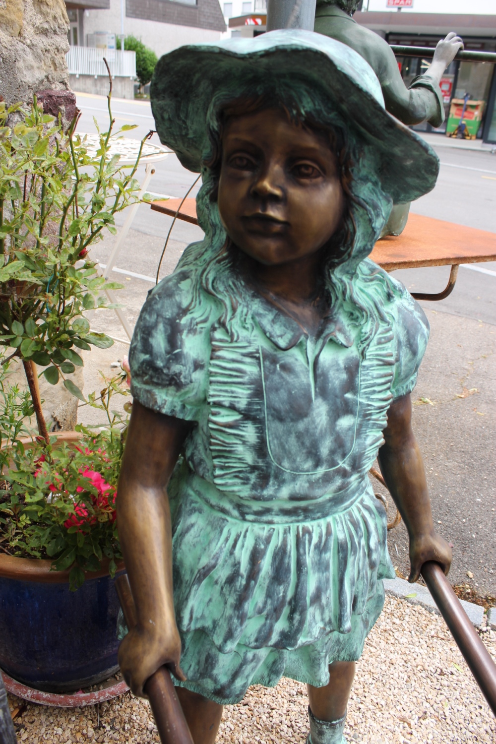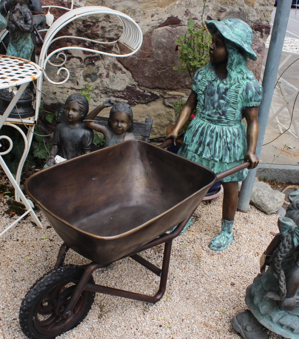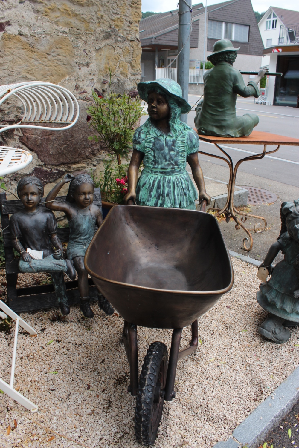 Bronzefigur / BronzeskulpturMädchen mit Stosskarette / Schubkarrefür Blumen.