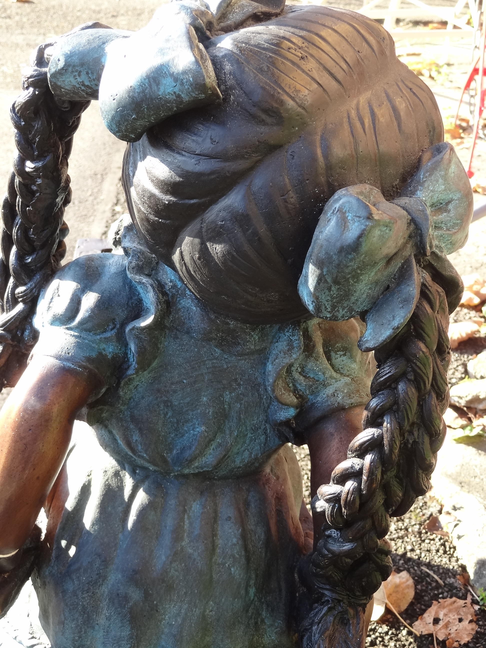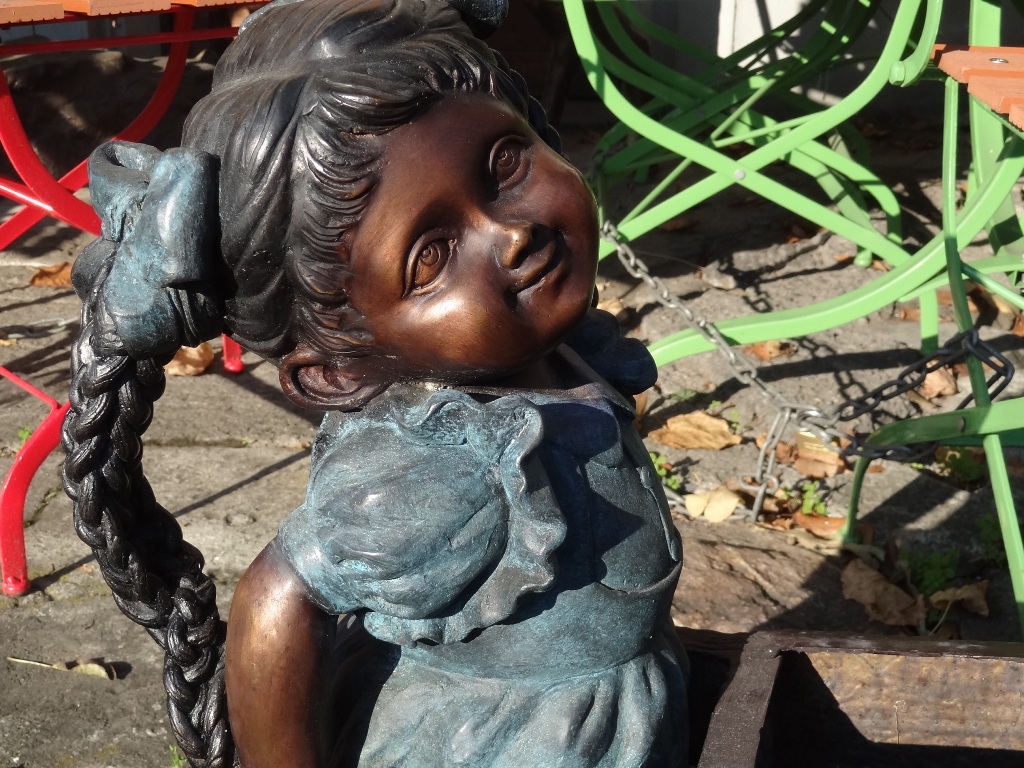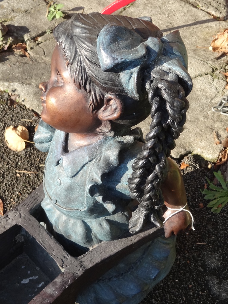 Liebliche Bronzefigur, Mädchen mit dicken langen Zöpfen.