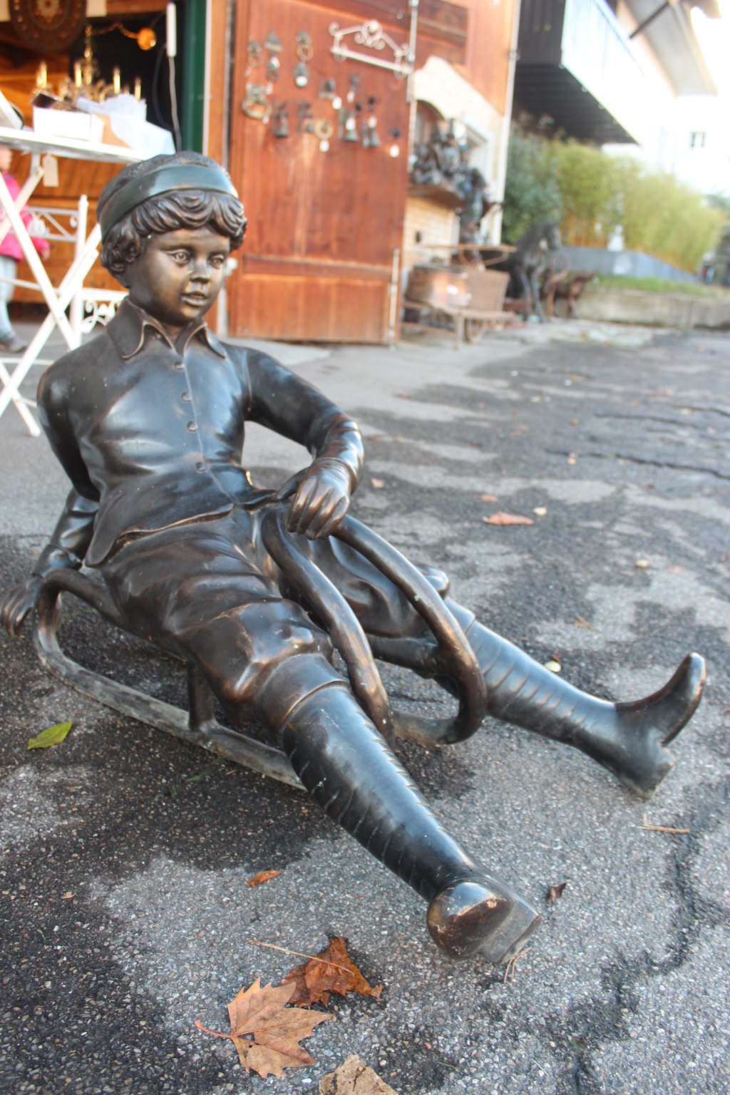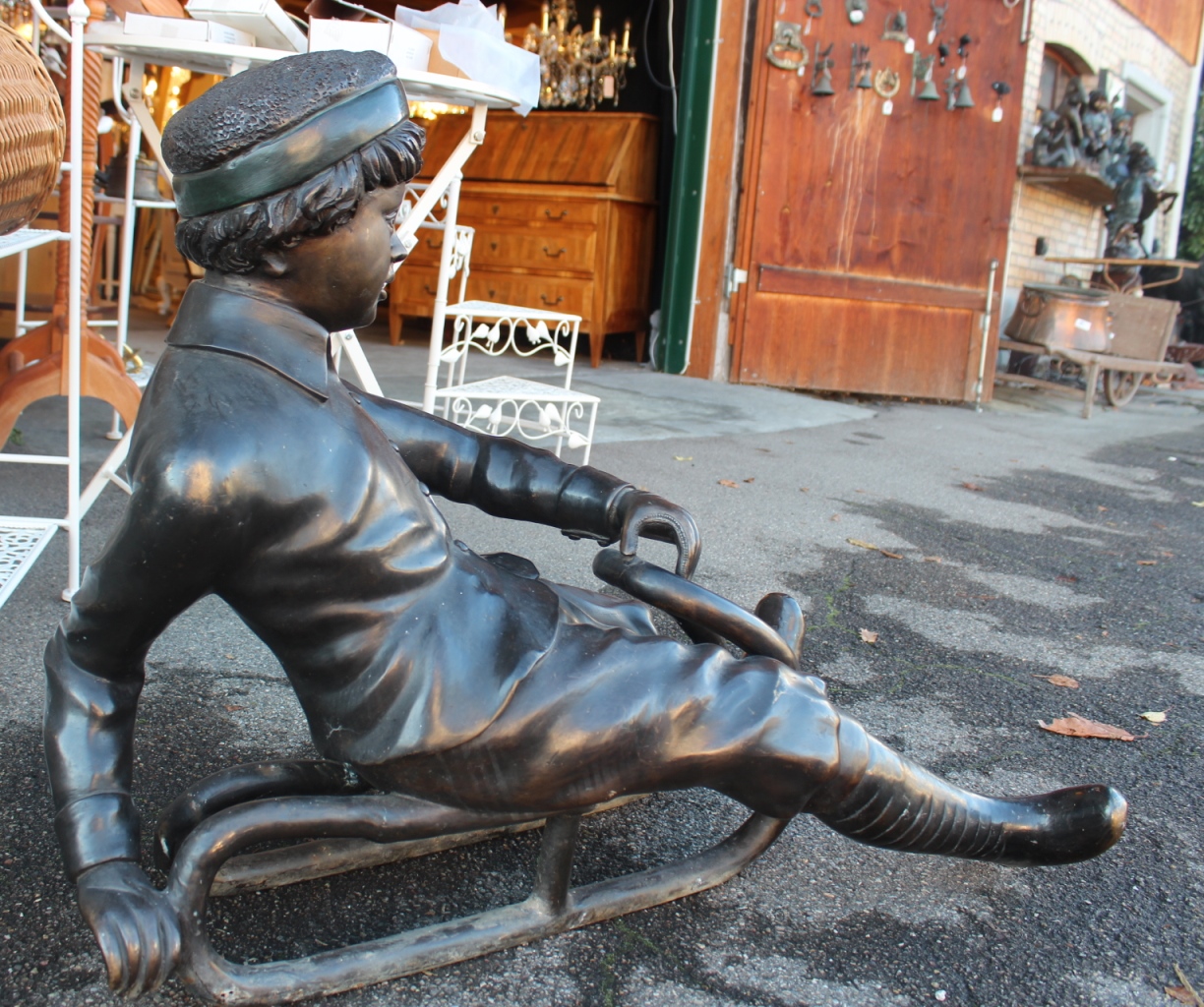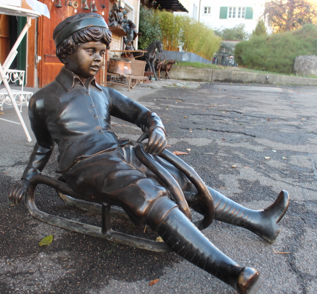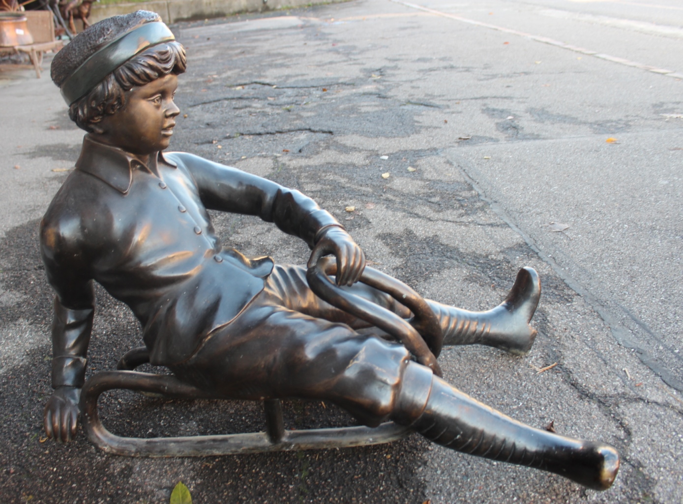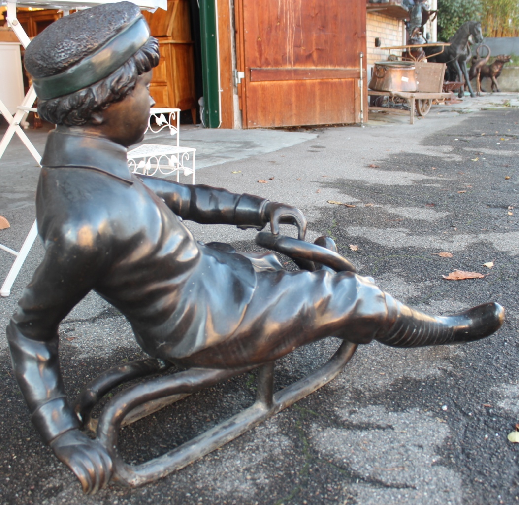 Einzigartige Bronzeskulptur / BronzefigurBub auf Schlitten.