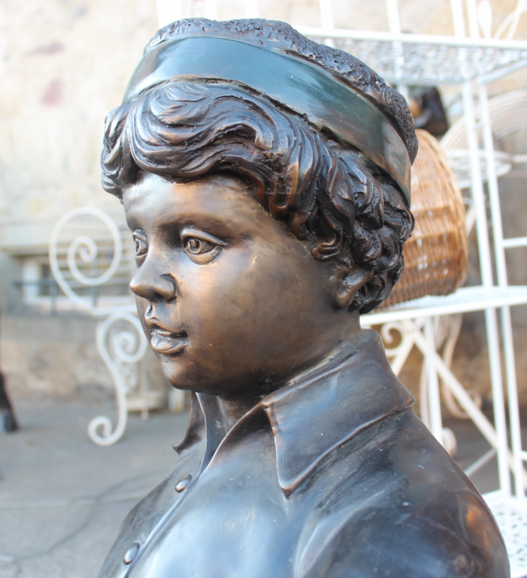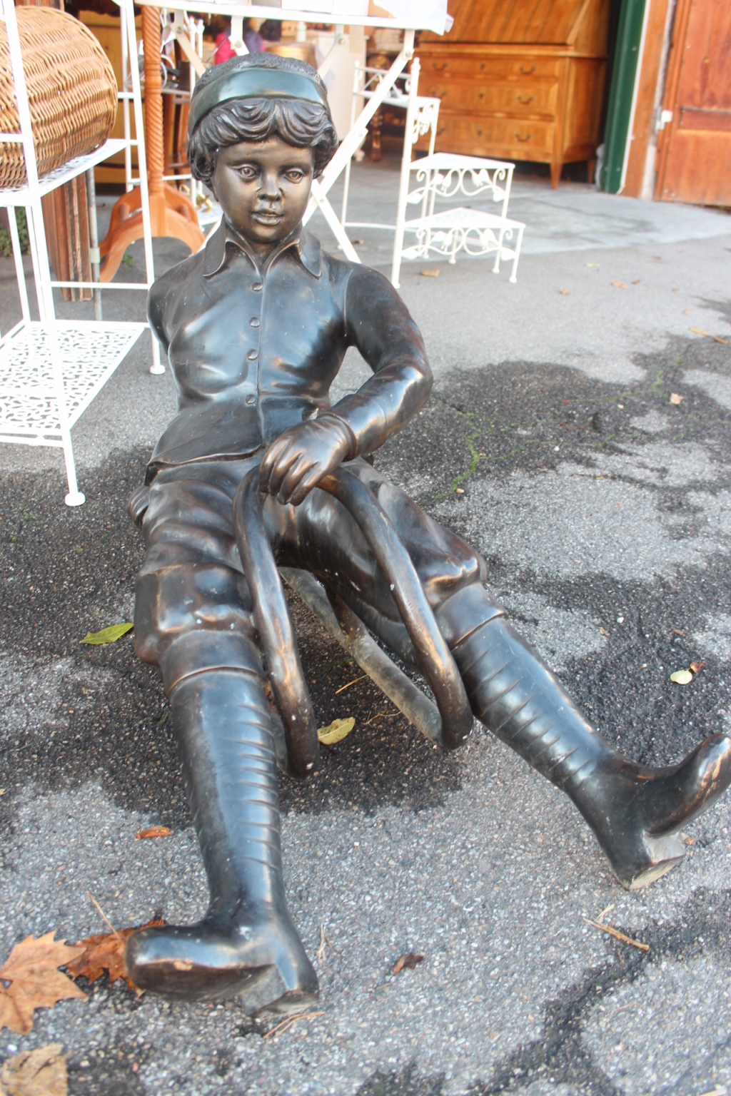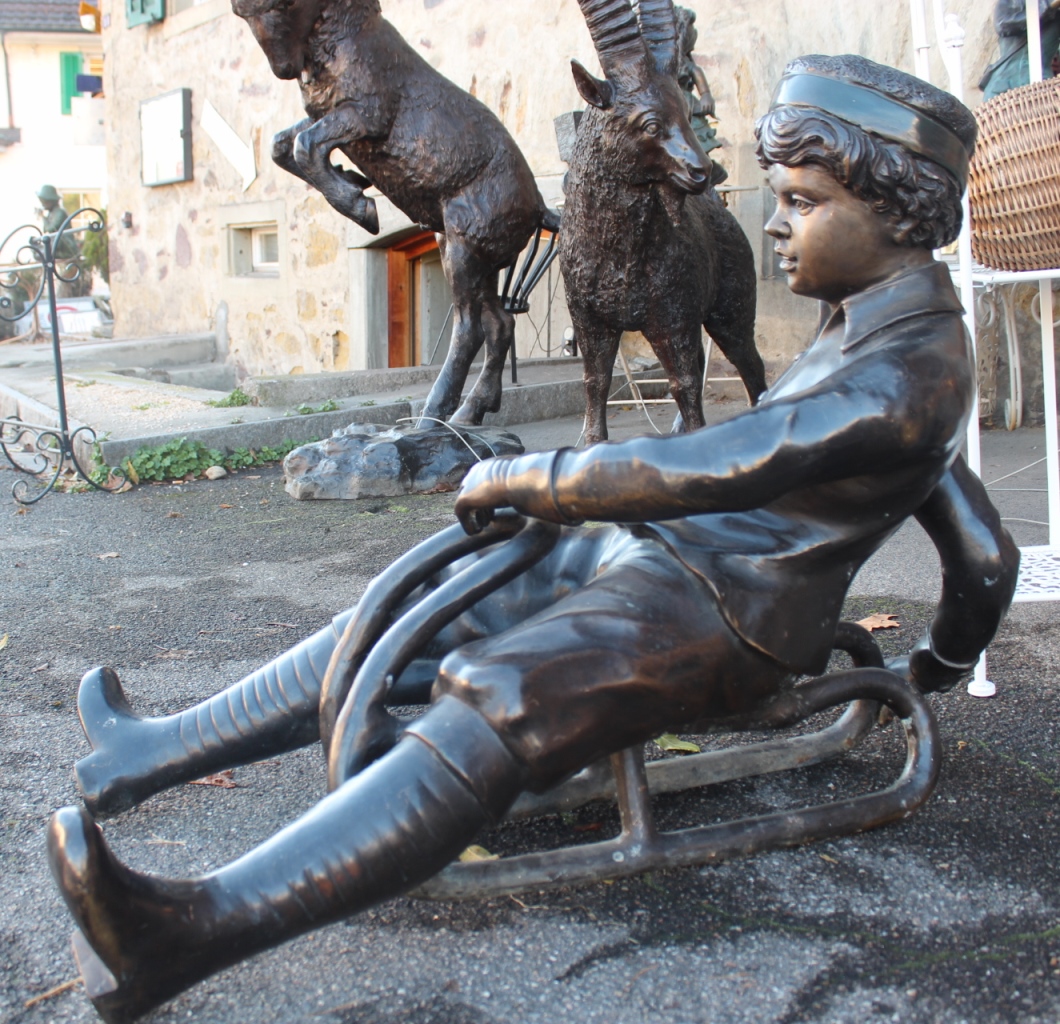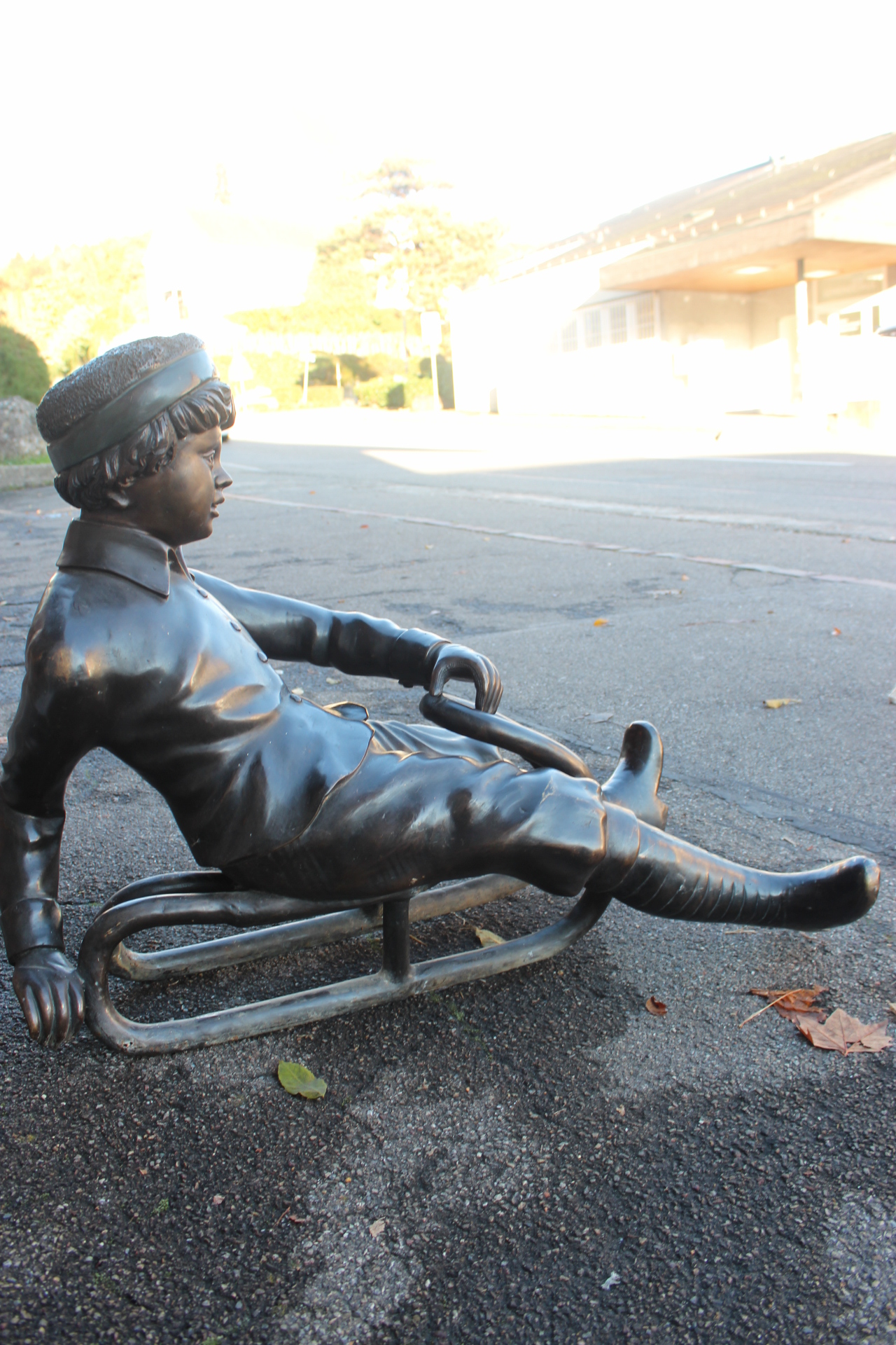 Einzigartige Bronzeskulptur / BronzefigurBub auf Schlitten.