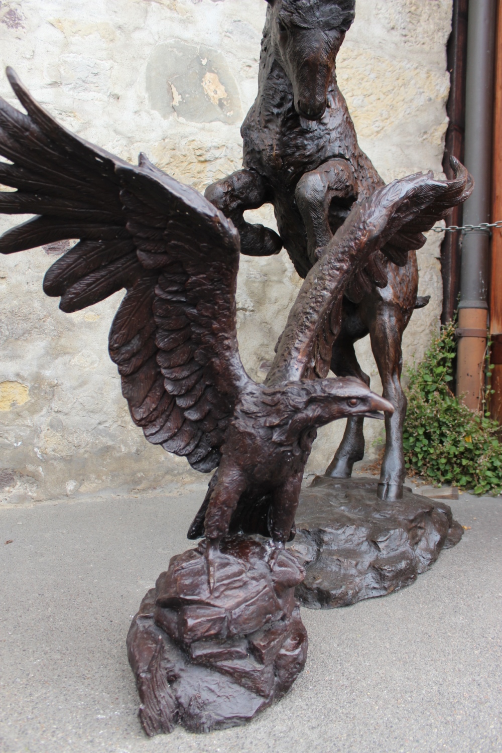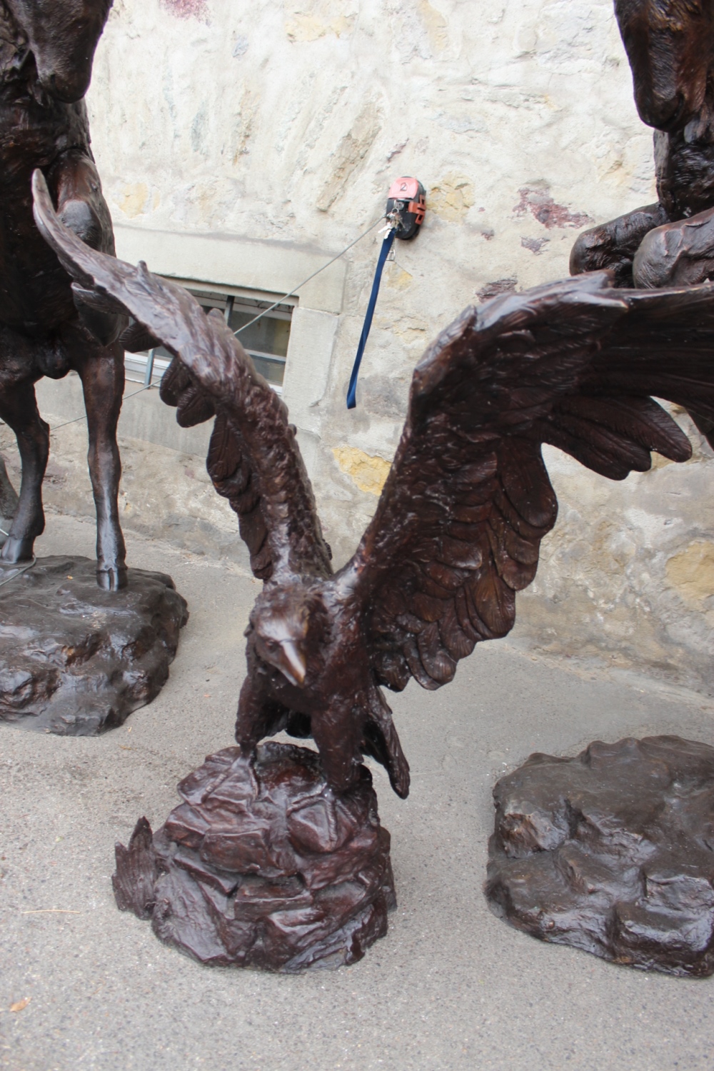 Majestätische Bronzeskulptur / BronzefigurAdler auf braunem Felsmit ausgestreckten Flügeln.